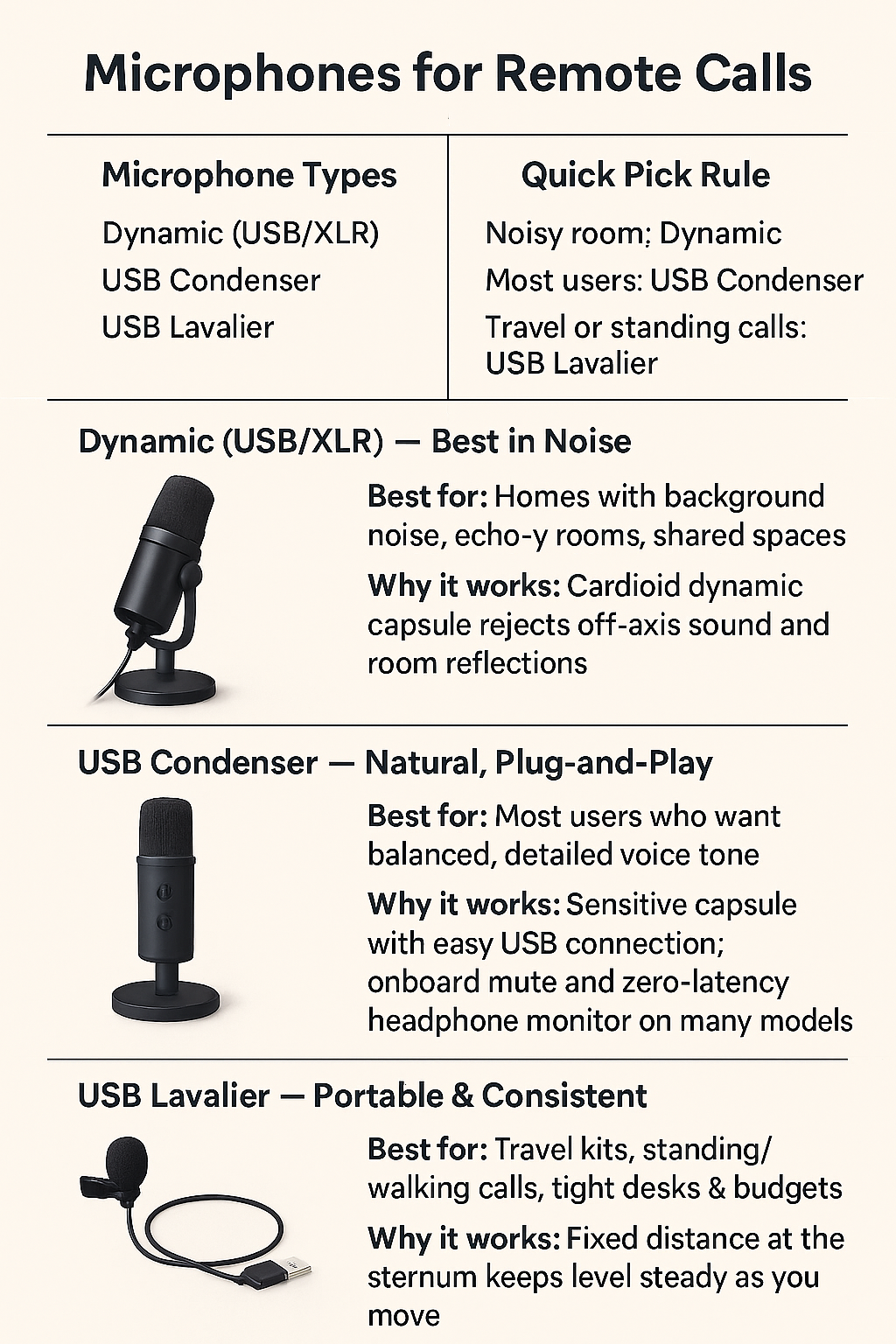 USB Clip-On LavMobile or tighter budgetsClose to mouth; consistent level; minimal desk clutter